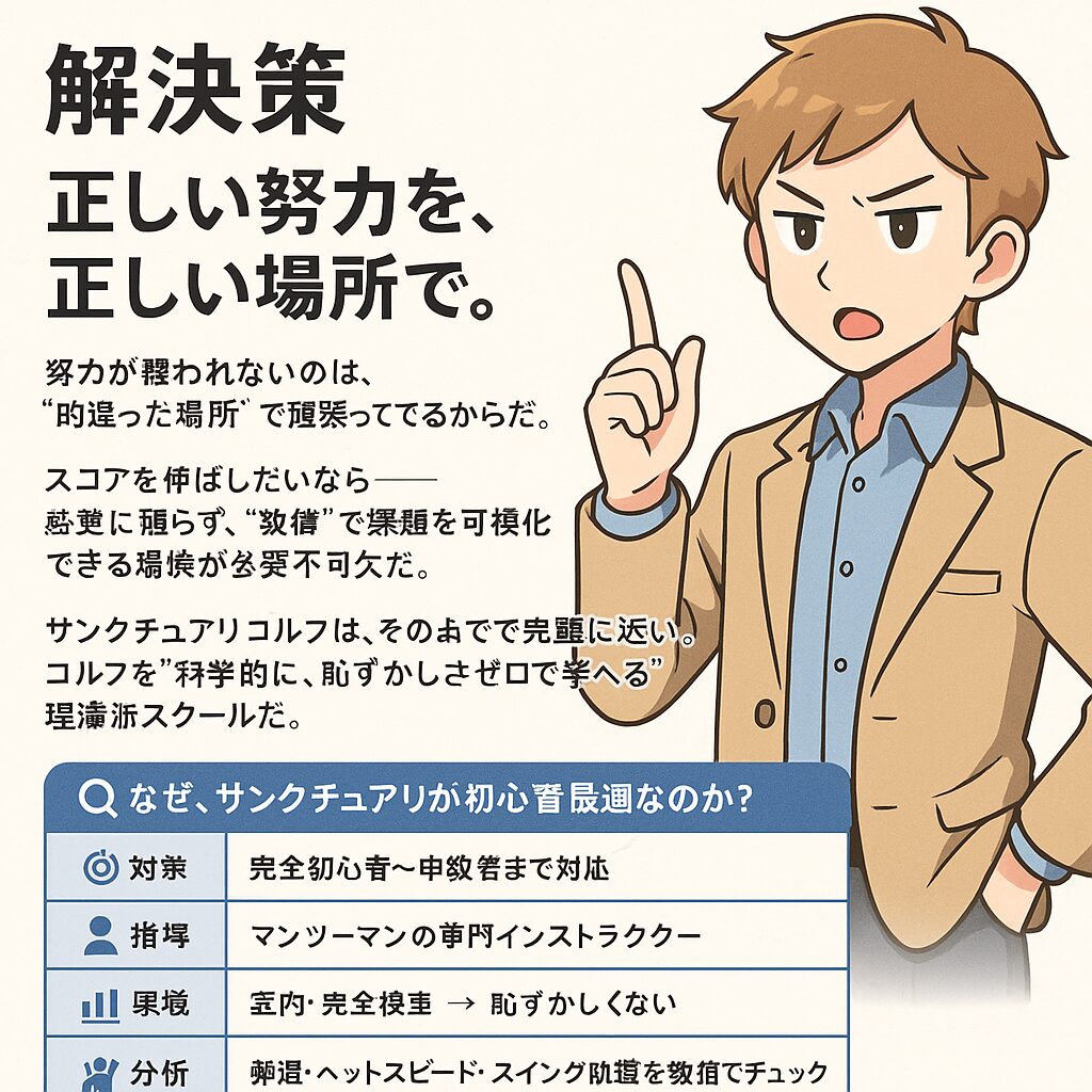 サンクチュアリゴルフなら、誰にも見られず、初心者目線で優しく、理論的に導いてくれる。